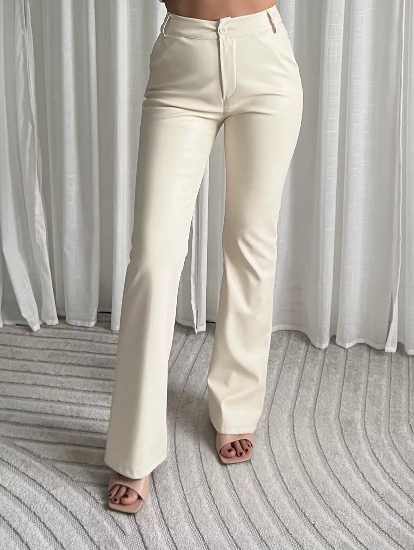 De leren broek is gemaakt van imitatieleer, heeft een hoge taille en rechte pijpen. Deze leather look broek is een echte must have! De frisse cream kleur is gemakkelijk te combineren. Stijl de broek met een leuk top en een paar hakken voor een complete look. De Leather Pants Kayla is ook verkrijgbaar in het zwart, beige of choco.