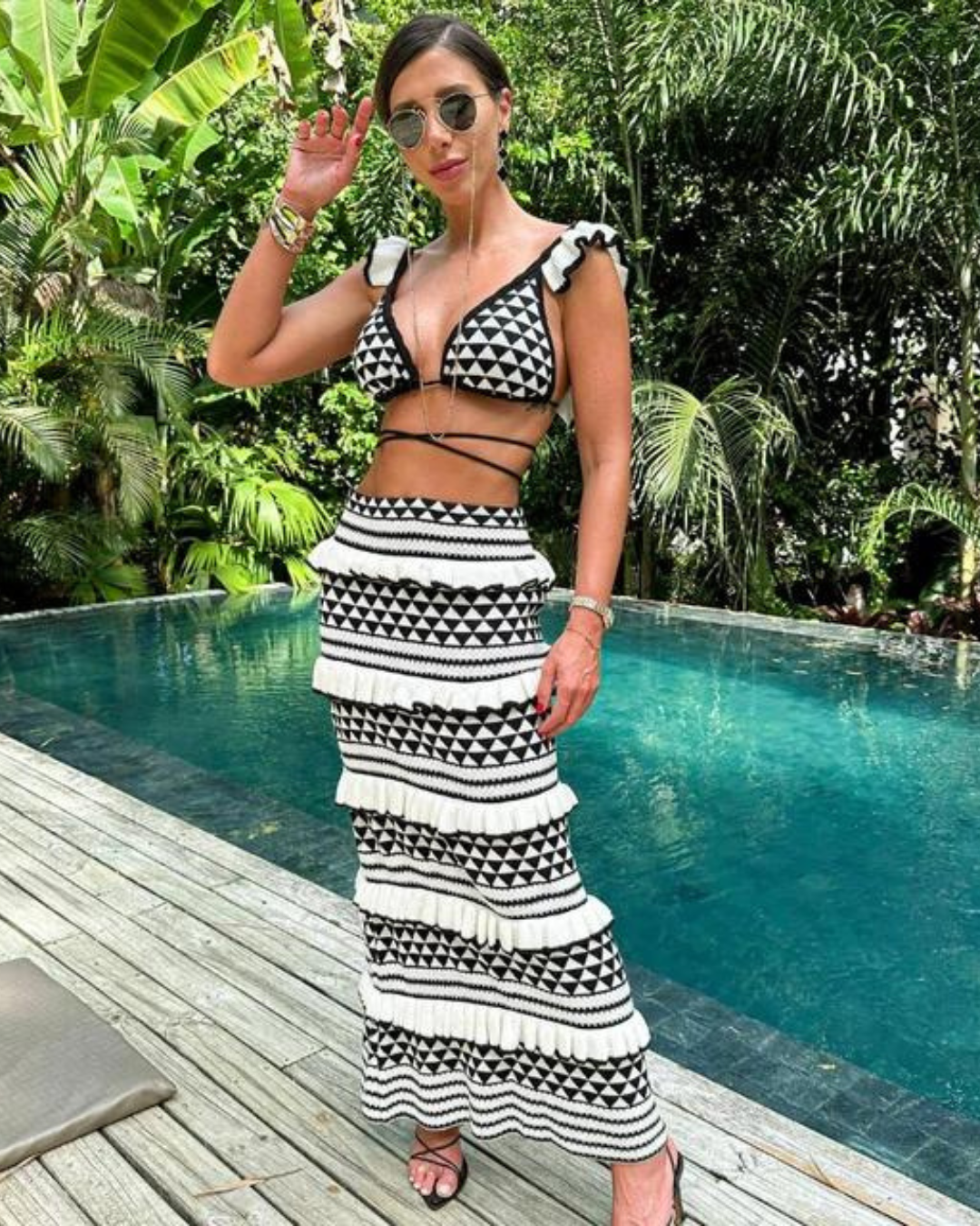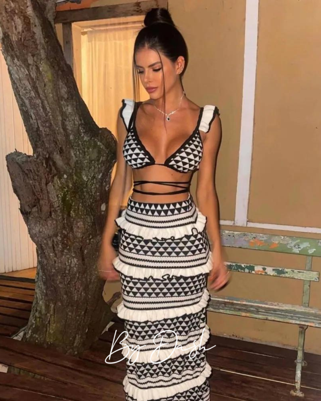 Of je nu ontspant op het strand, geniet van een poolparty of een wandeling maakt langs de kust, deze halter bikini top en rok set zal je laten stralen met zijn vrolijke uitstraling en comfortabele pasvorm. Bestel nu en maak je klaar voor een zomer vol plezier en avontuur!