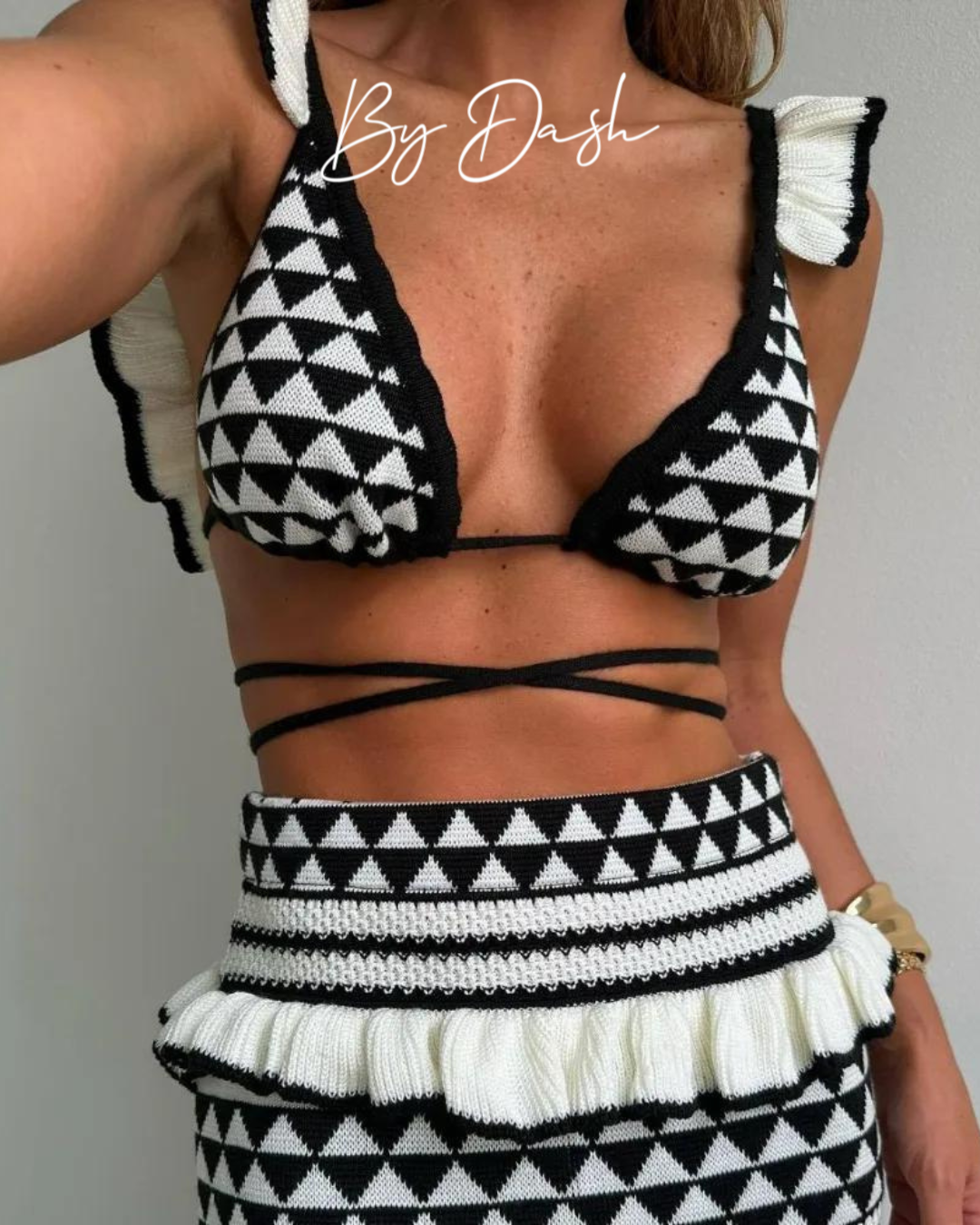 1. Gebreide Verfijning: Elk stuk van deze set is zorgvuldig vervaardigd uit hoogwaardige gebreide stoffen, die niet alleen zacht aanvoelen maar ook een subtiele textuur en elegantie toevoegen aan je strandlook.