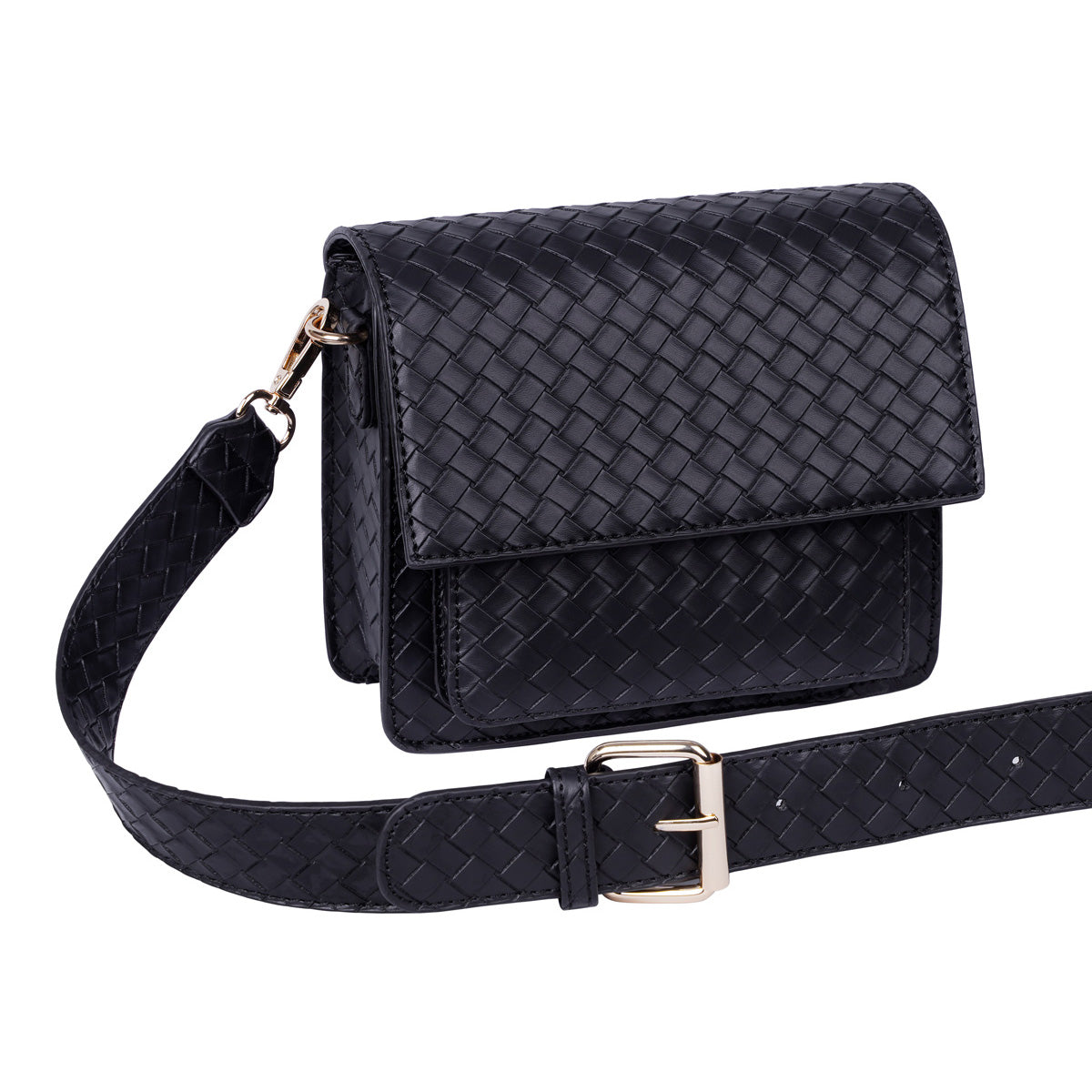 De gevlochten schoudertas heeft een afneembare schouderband en een magneetsluiting. Deze tas is ook verkrijgbaar in het roze, blauwpaars en off white.