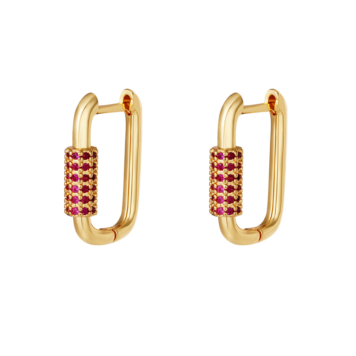 Rechthoekige gouden oorbellen met rode sierstenen